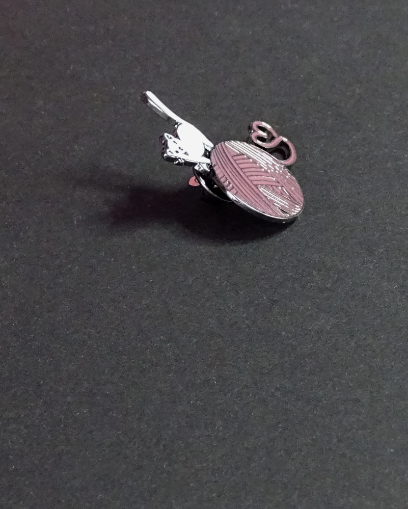 Der Pin ist ein Wollknäeul, auf dem eine Katze "turnt". Das Ende des Wollfadens bildet sich ein Herz.