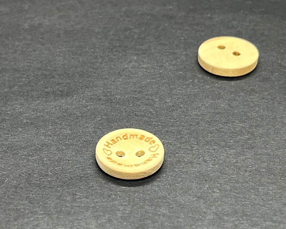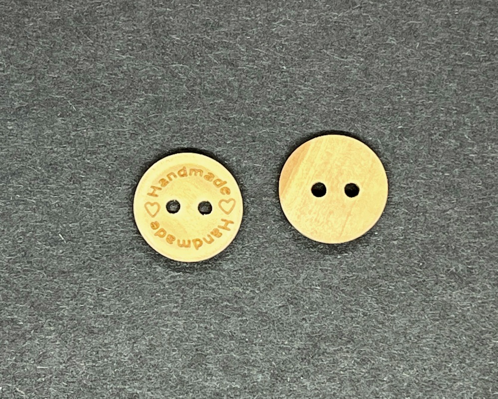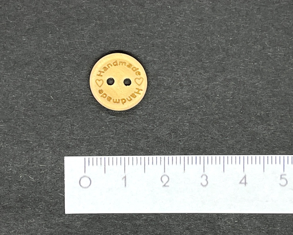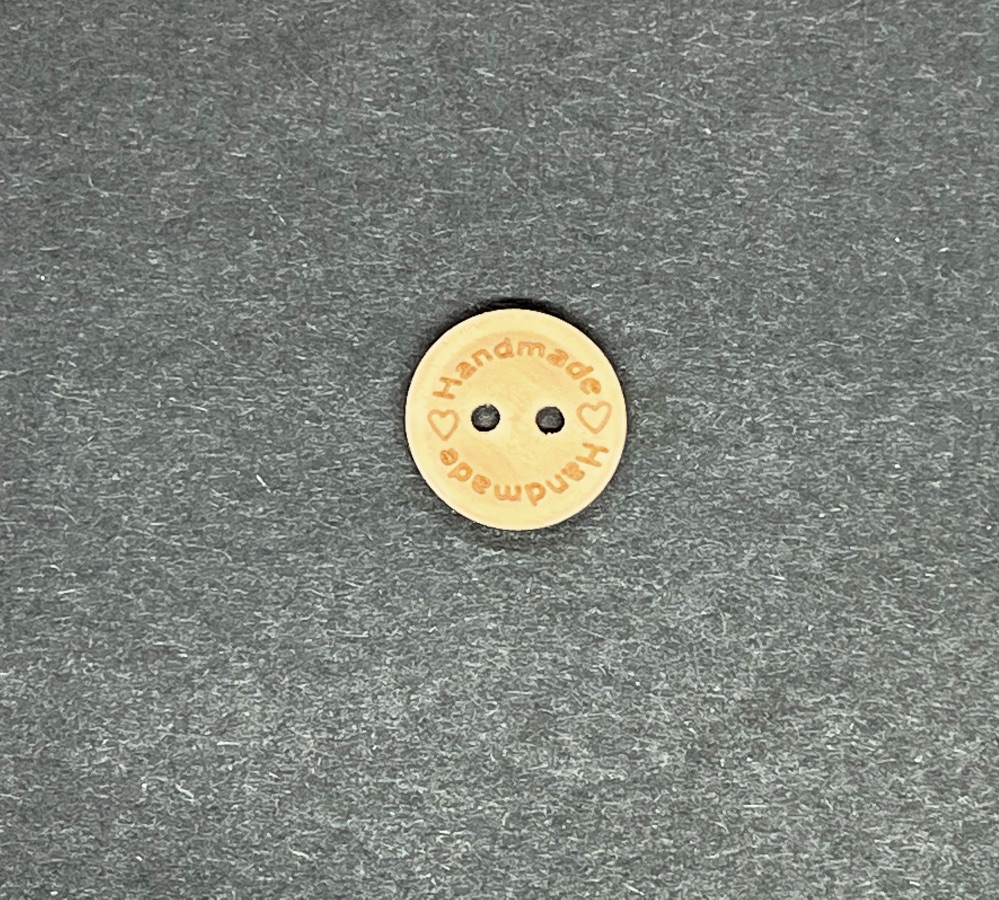 Der Knopf ist geprägt mit dem Schriftzug "Handmade" (Handgemacht/ Handgefertigt) und zwei kleinen Herzchen.