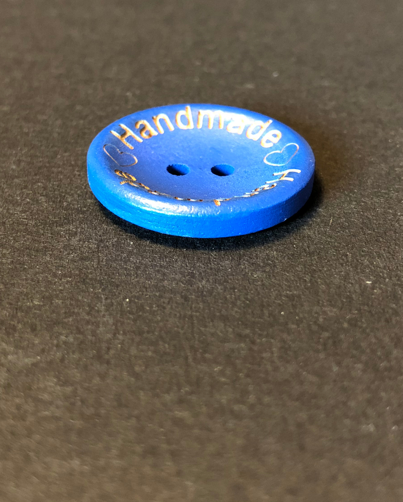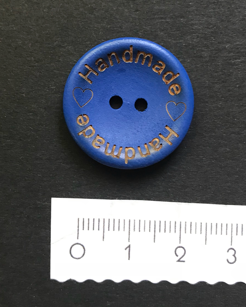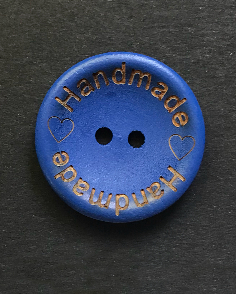 Der Knopf ist geprägt mit dem Schriftzug "Handmade" (Handgemacht/ Handgefertigt) und zwei kleinen Herzchen.