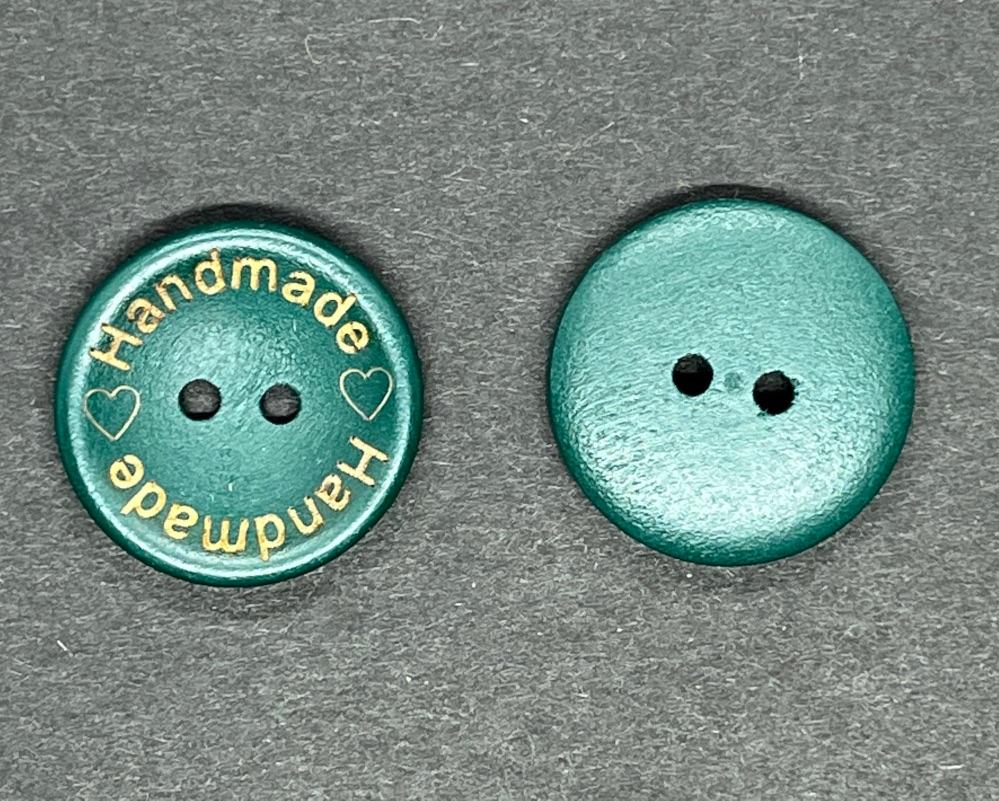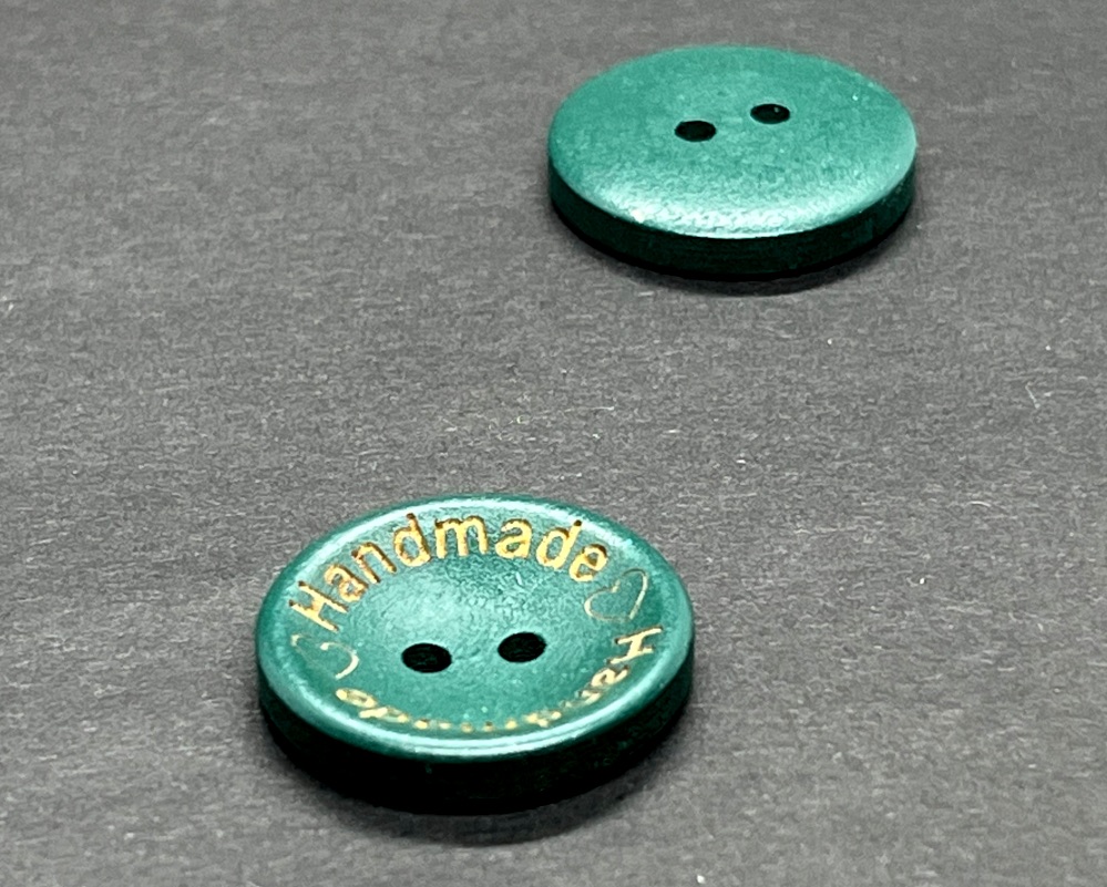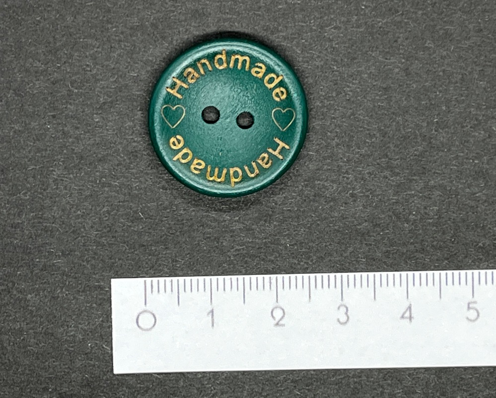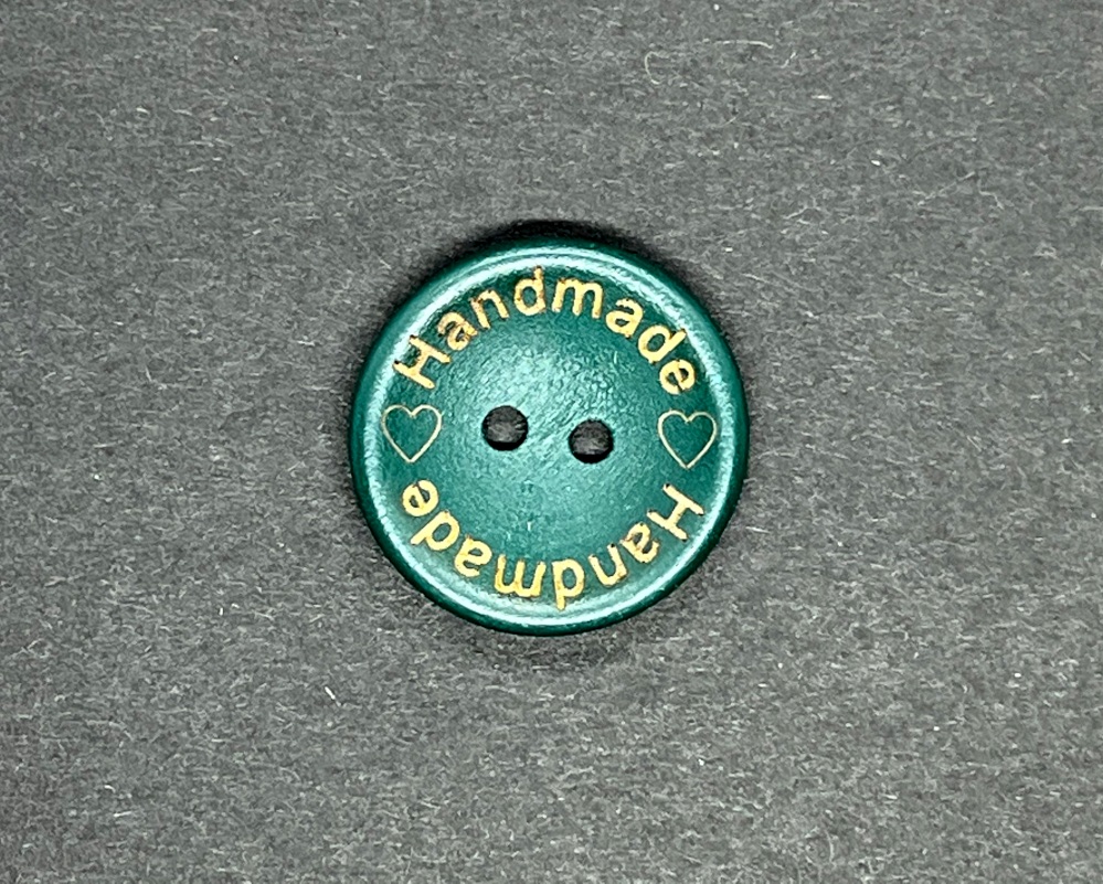 Der Knopf ist geprägt mit dem Schriftzug "Handmade" (Handgemacht/ Handgefertigt) und zwei kleinen Herzchen.