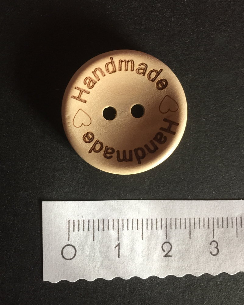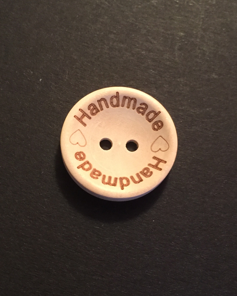 Der Knopf ist geprägt mit dem Schriftzug "Handmade" (Handgemacht/ Handgefertigt).