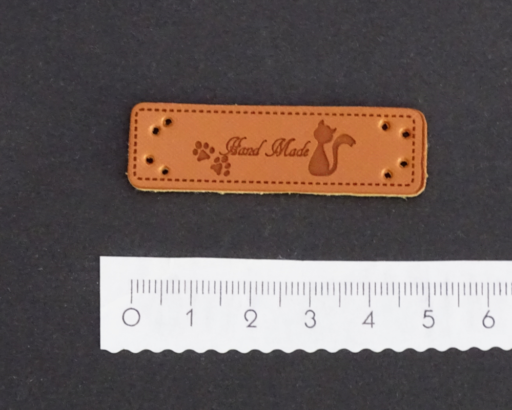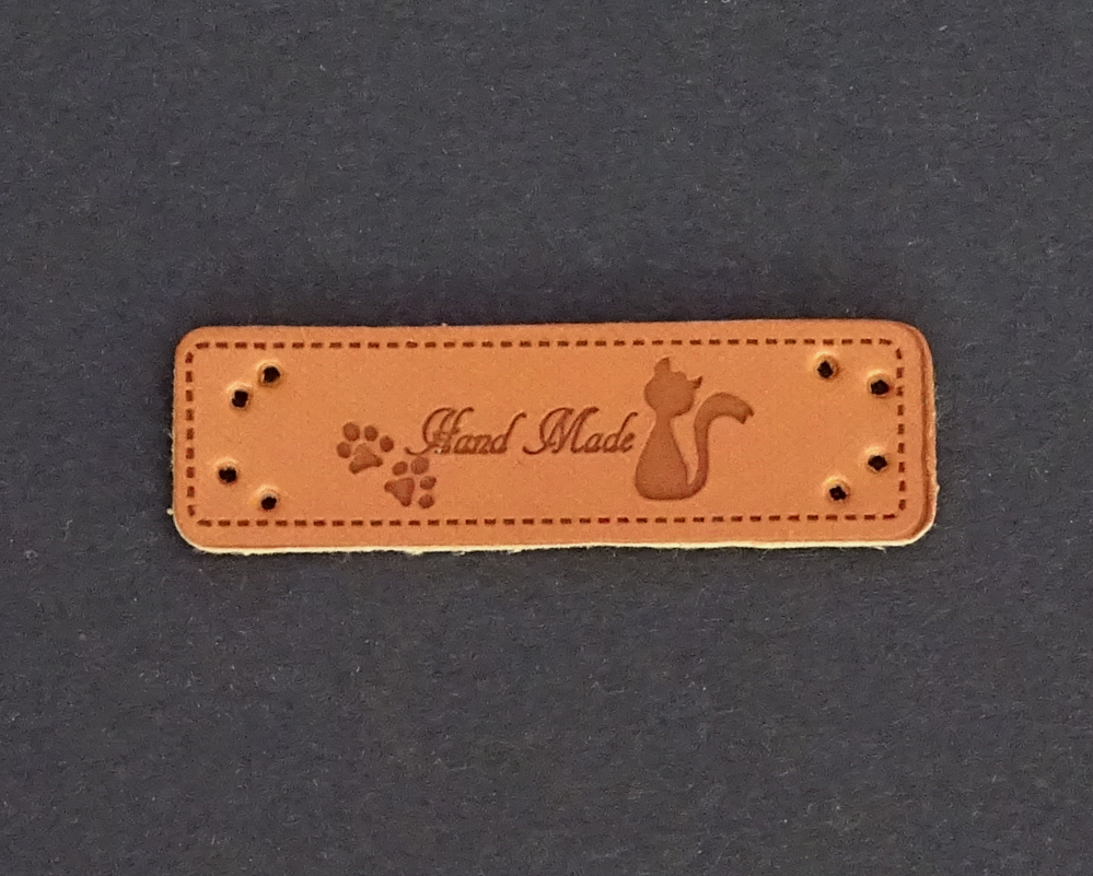 Ein Kunstlederschild mit dem Schriftzug "Handmade" (Handgemacht/ Handgefertigt) und einer Katze mit Pfotenabdrücken darauf.
