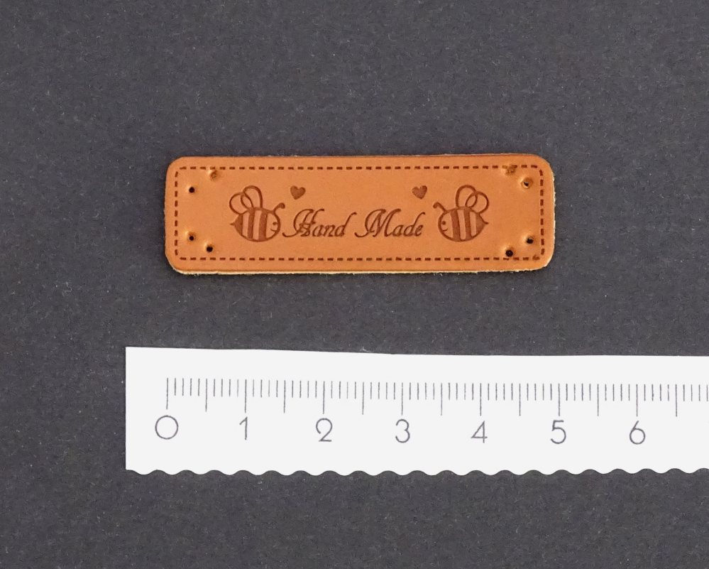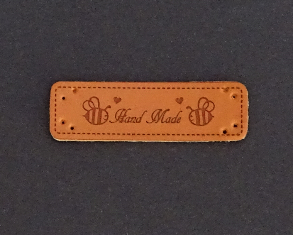 Ein Kunstlederschild mit dem Schriftzug "Handmade" (Handgemacht/ Handgefertigt) und zwei Bienen darauf.