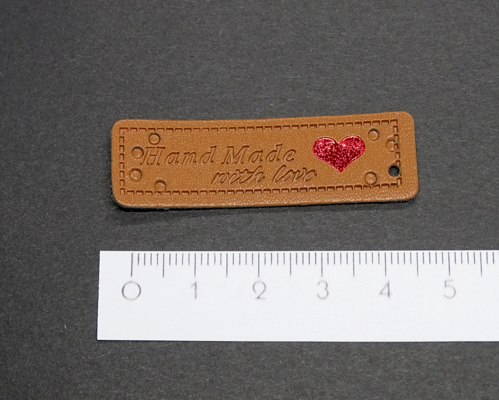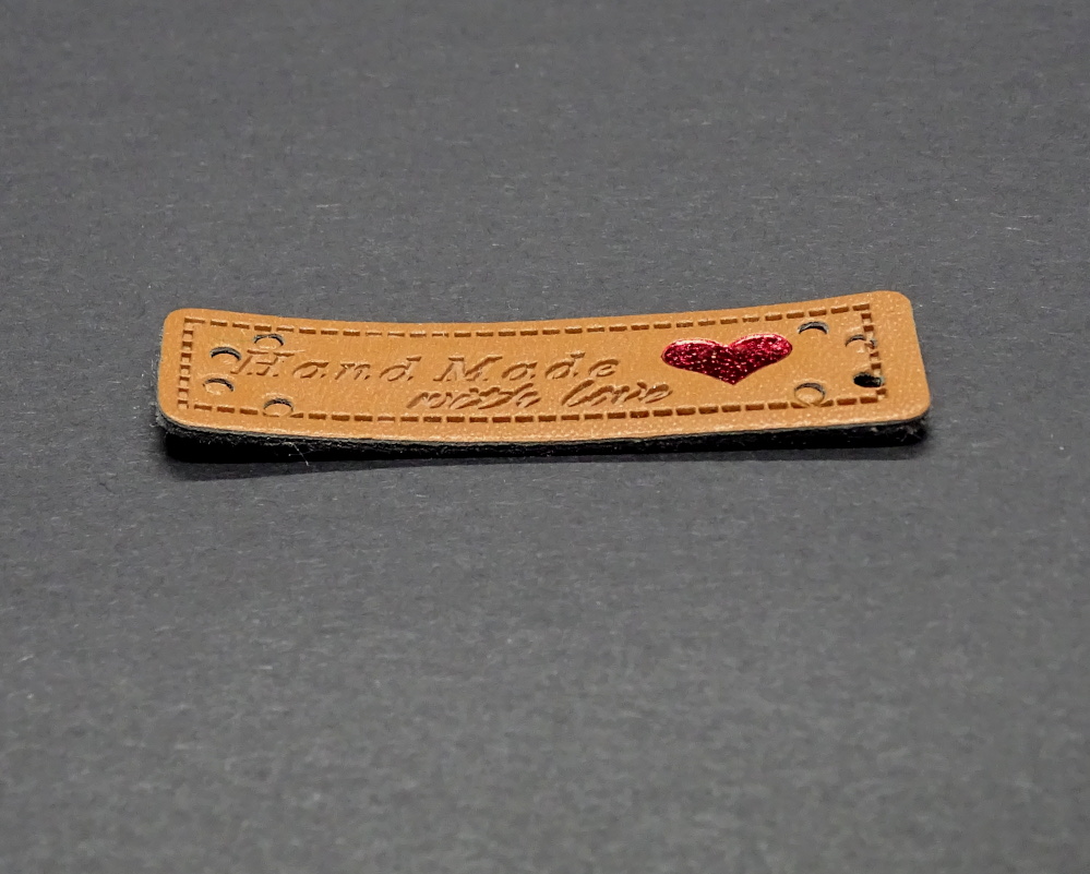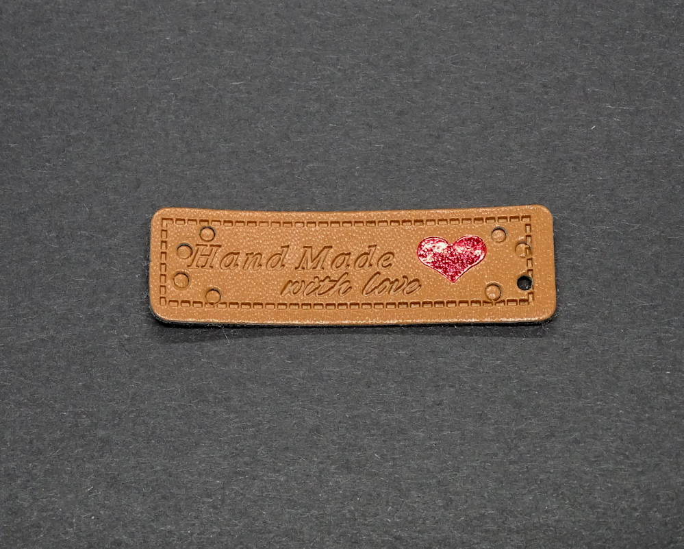 Ein Kunstlederschild mit dem Schriftzug "Handmade with love" (Handgemacht/ Handgefertigt mit Liebe) und einem roten Herz darauf.