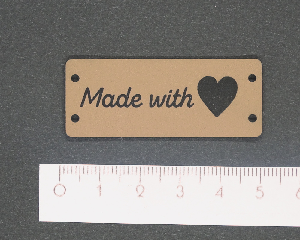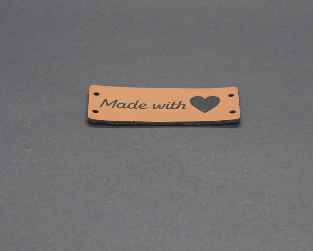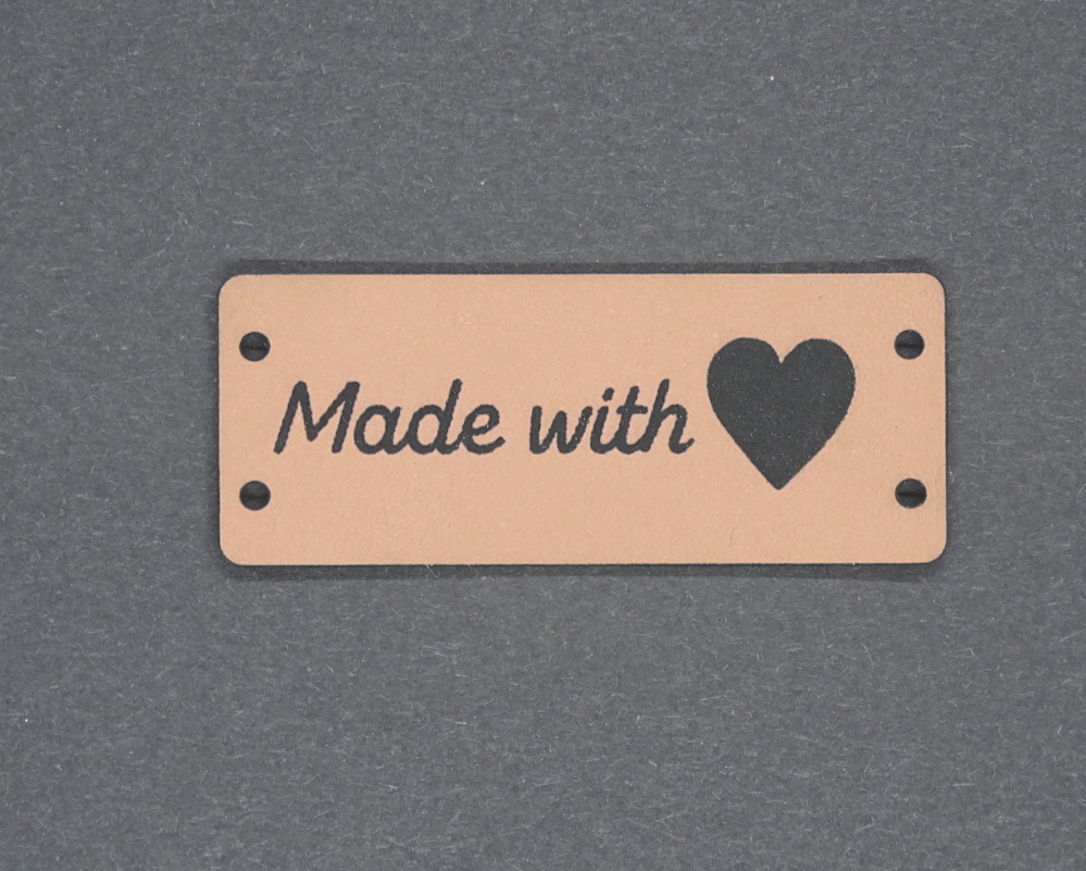 Ein Kunstlederschild mit dem Schriftzug "Made with" (Gefertigt mit...) und einem großen Herzen.