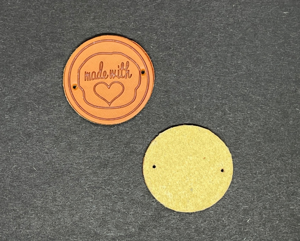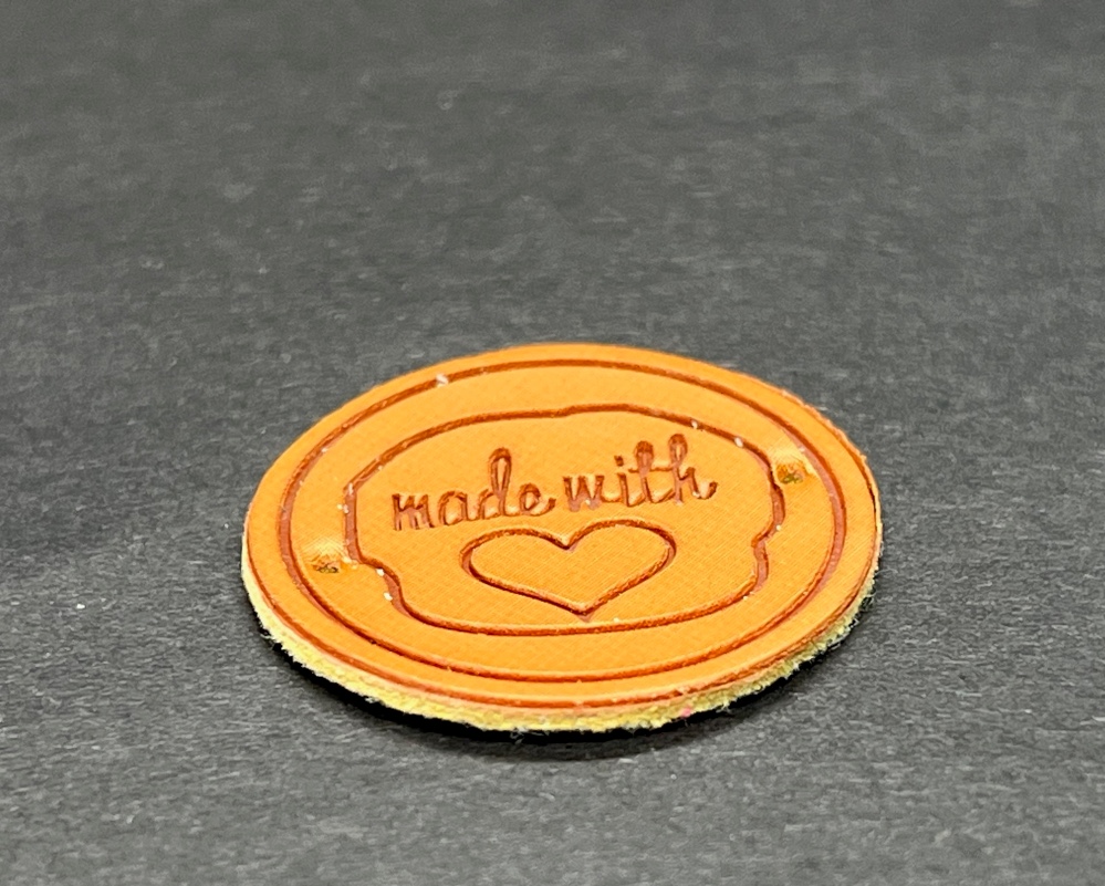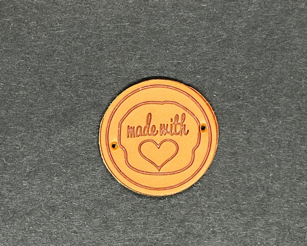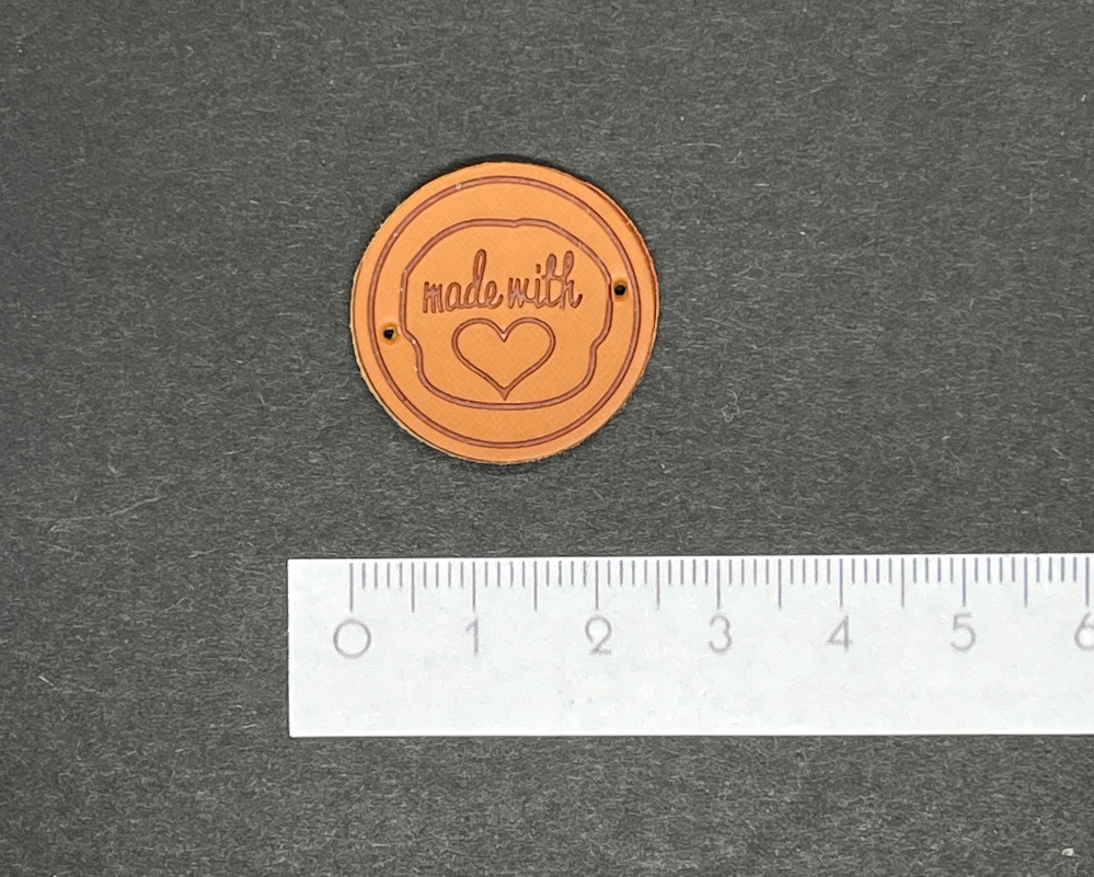 Ein Kunstlederschild in rund mit dem Schriftzug "Made with" ("Gemacht mit") und einem Herz.