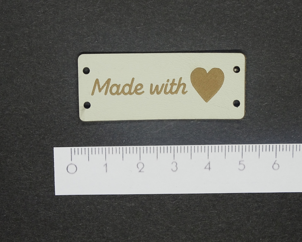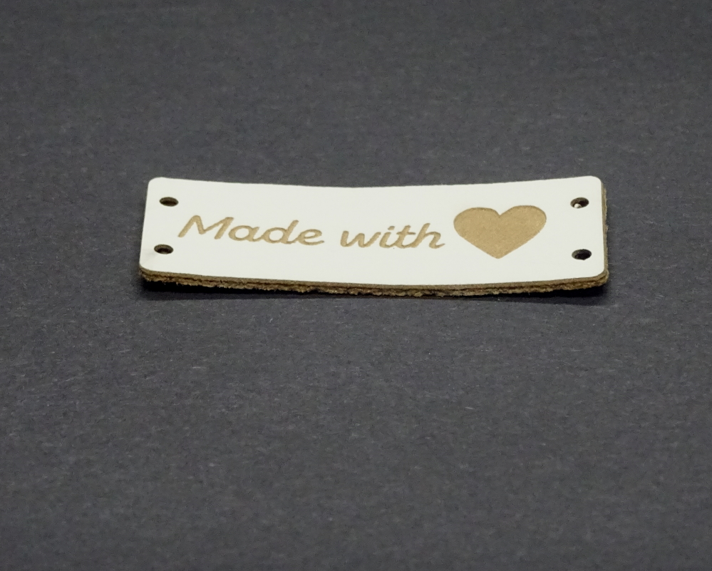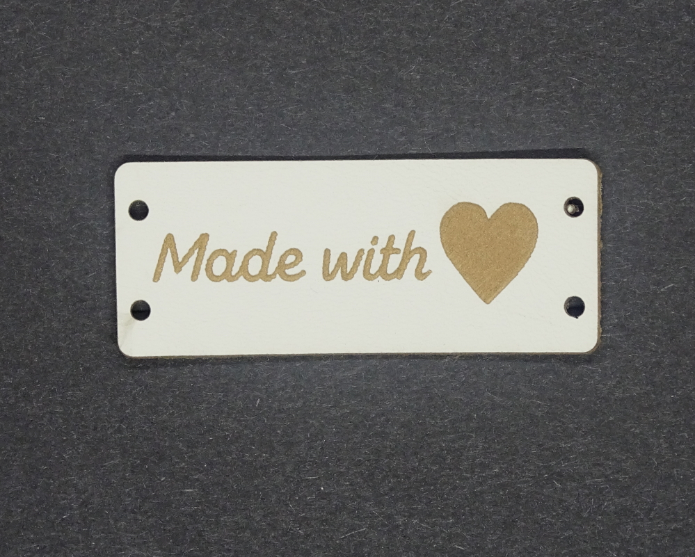 Ein Kunstlederschild mit dem Schriftzug "Made with" (Gefertigt mit...) und einem großen Herzen in gold.