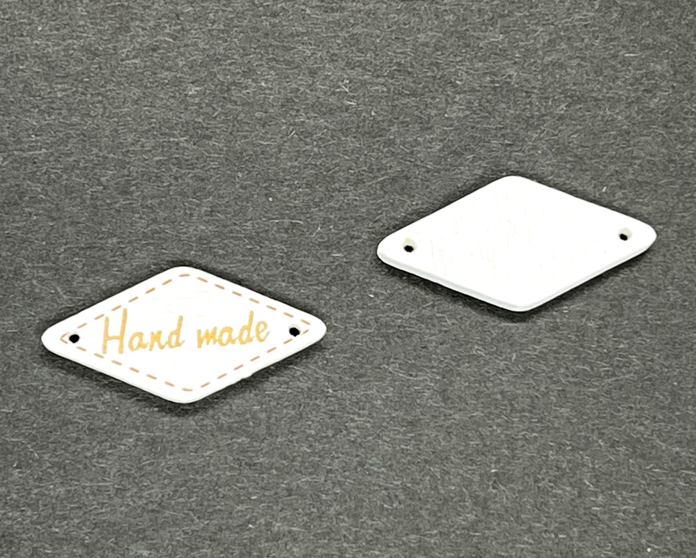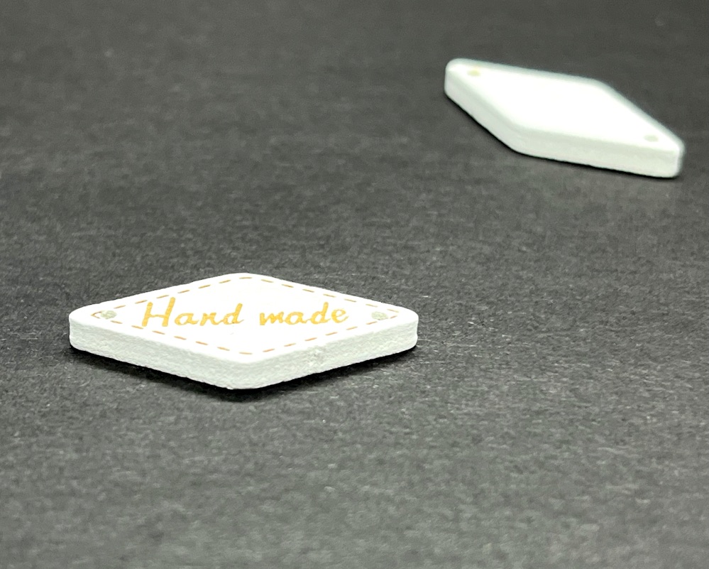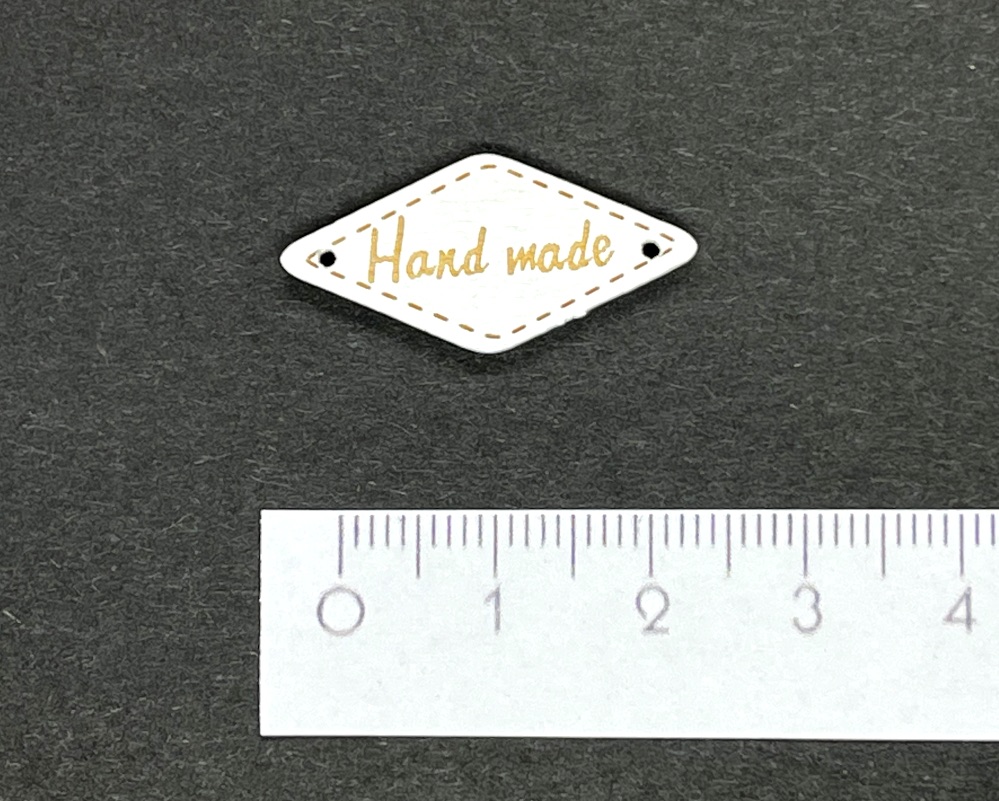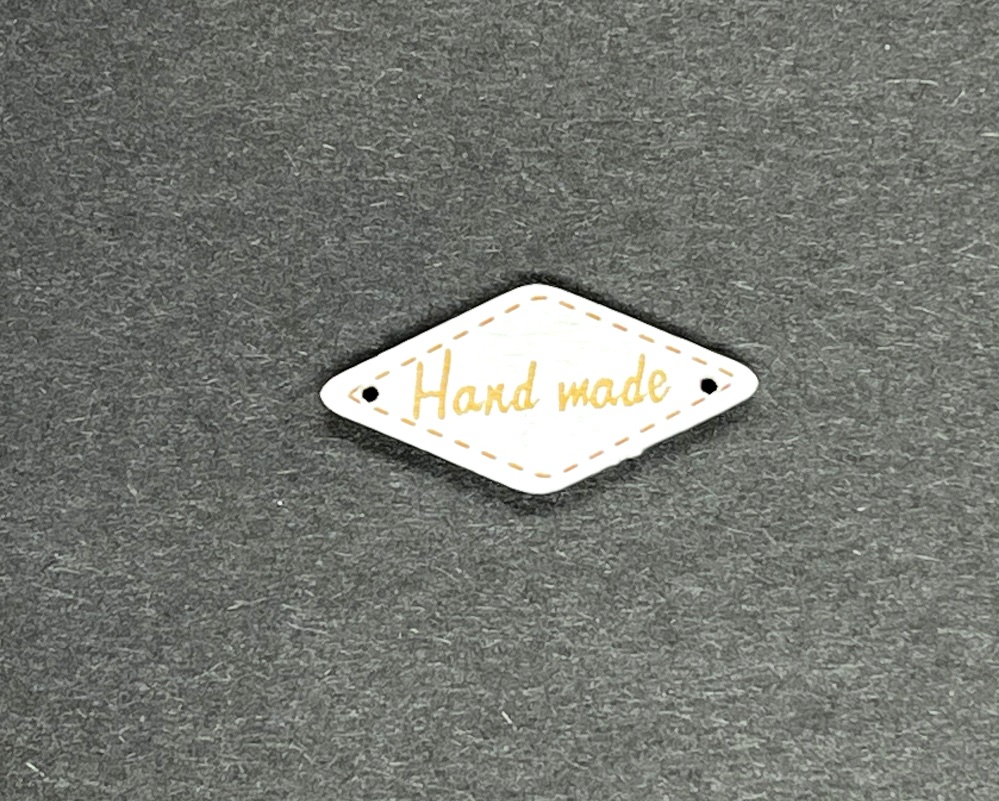 Das Schildchen ist rautenförmig und geprägt mit dem Schriftzug "Handmade" (Handgemacht/ Handgefertigt).
