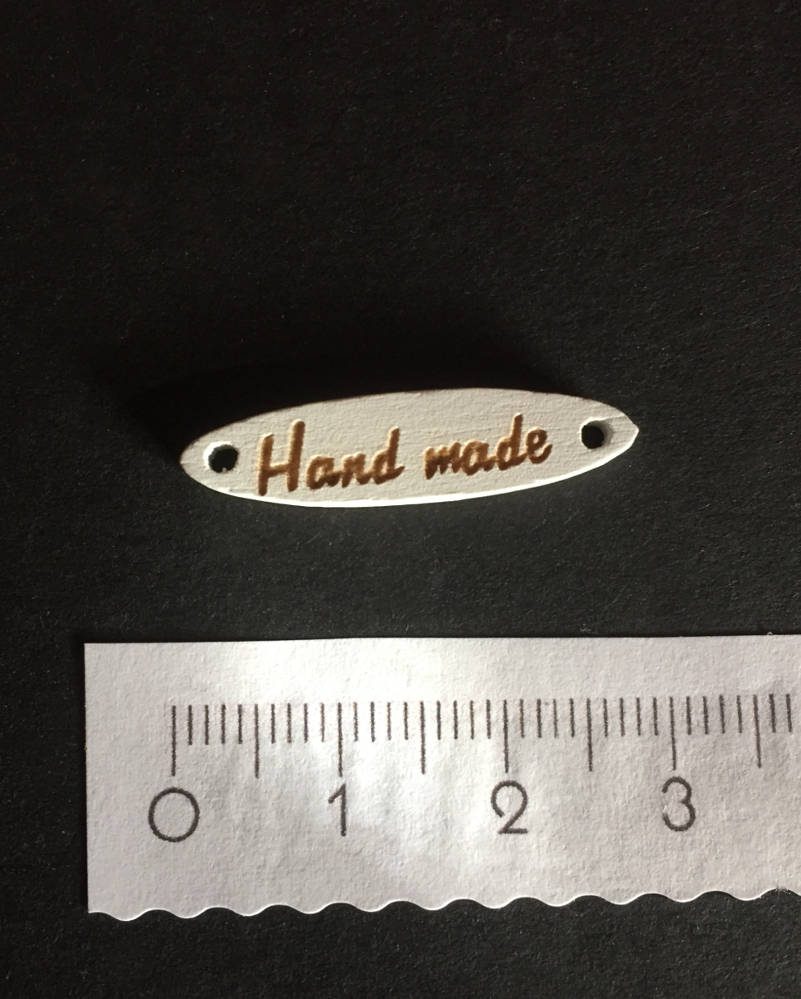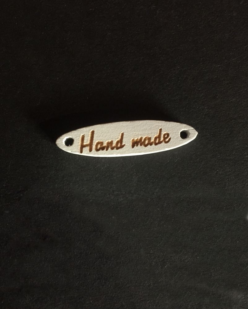 Das Schildchen ist geprägt mit dem Schriftzug "Handmade" (Handgemacht/ Handgefertigt).