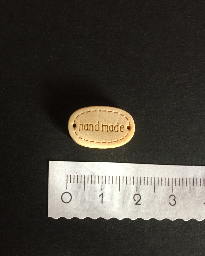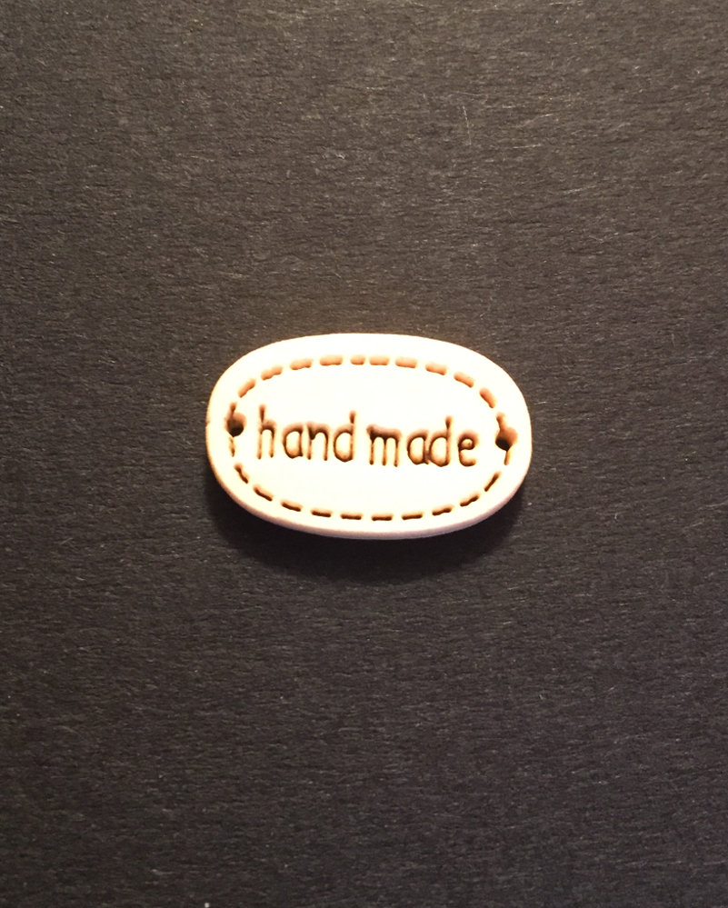 Das Schildchen ist geprägt mit dem Schriftzug "Handmade" (Handgemacht/ Handgefertigt).